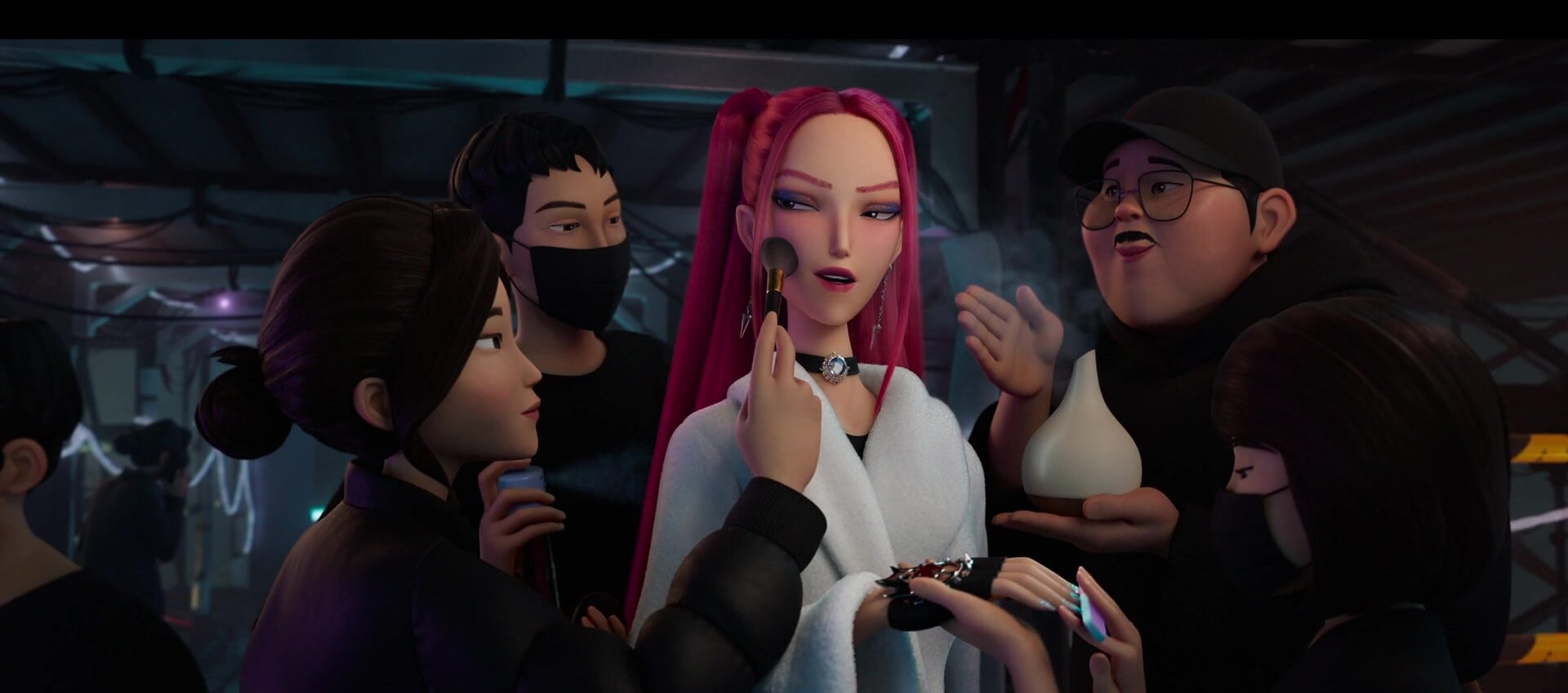Filmin görsel dili de duruşunu netleştiriyor. Dijital animasyonun soğuk yüzeye düşebilecek cam gibi mükemmelliği burada es geçilmiş. Görüntü dokusuna, geleneksel Kore kırkyama sanatını (jogakbo) anıştıran titreşimler, yamalı dokular yerleştirilmiş. Bu yeğleyiş, geçmişin el emeği ile şimdinin teknolojisi arasında bir geçiş kuruyor. Karakterlerin konser sahnelerindeki o insanüstü (idol) pürüzsüzlüğü ile çatışma anlarında anatomik düzgünlüğü bozan, esneyip bükülen çizgileri, dayatılan vitrin ile içsel taşkınlık arasındaki uçurumu açığa seriyor. Film, tek bir “sabit yüz”e razı değil. Pop yıldızı anlarında daha “parlatılmış”, aksiyon ve komedide daha “abartılı” yüz tasarımlarına kayabilen bir ifade sistemi kuruyor; anime esinli bir görünümü 3B’nin diliyle birleştirirken, ton değişimini doğrudan karakterin yüzünde okutur hale geliyor. Bu, filmin temasıyla aynı yerden konuşan bir teknik, maske ile yüz arasındaki gerilim, anlatıda olduğu kadar animasyonda da canlı kalıyor.